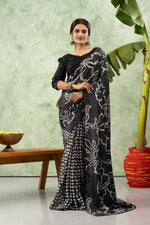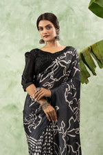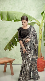 Make a sophisticated statement with this stunning black and grey chiffon saree. Crafted from elegant chiffon fabric, it offers a lightweight, airy feel and a beautifully fluid drape that complements any figure. The digital print and coordinated border add a touch of contemporary flair, while the stitched blouse is accented with delicate beadwork for subtle glamour.