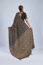 Wrapped in bold elegance and timeless artistry, this black chiffon saree is adorned with striking yellow Ajrak patterns. Its flowing drape and striking contrast make it an exquisite choice for festive evenings and cultural celebrations.