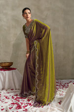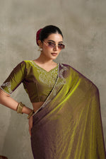 Drape yourself in royal elegance with this dual-tone green and purple NC moss saree featuring a shimmering finish and finely embroidered borders. The play of earthy purple with vibrant green makes it a versatile pick for both festive and wedding occasions. Perfect for women who love a bold yet traditional appeal, this saree blends contemporary charm with timeless cultural heritage.