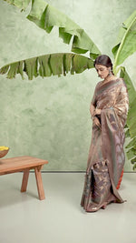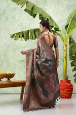 A refined blend of tradition and modern style, this grey Jacquard saree features a rich pallu with position print and digital padding—perfect for festive occasions.