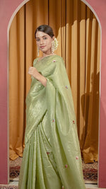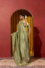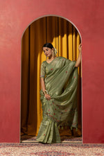 This elegant green Crush Silk saree features exquisite dyed Kashmiri handwork. Its fresh hue and heritage-inspired design make it ideal for festive and cultural occasions.