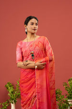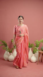 Glow brightly in this vibrant orange sparkle georgette saree, featuring a subtle shimmer and fresh digital print designs. Comes with a matching unstitched blouse piece for a personalized, elegant look—perfect for festivals and cultural celebrations.