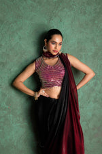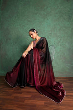 Wrapped in tradition and modern elegance, this deep red saree pairs luxurious chiffon with a bold black border. Designed to stand out, it brings sophistication and charm to every celebration.