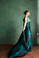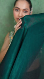 This deep mehndi NC satin saree with a black-padded embroidered border and stitched blouse is an exquisite choice for weddings, festivals, and special occasions.