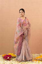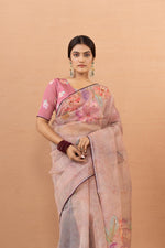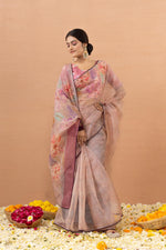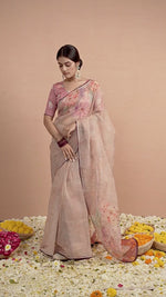 A soft pink tissue saree that gracefully blends tradition and modernity with delicate digital Aari print. Lightweight, elegant, and perfect for festive occasions.