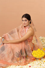 This orange saree with digital printed Aari work offers a perfect balance of traditional beauty and contemporary style, making it ideal for festive occasions and special celebrations.