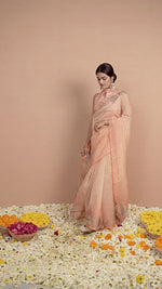 A bold and festive orange tissue saree enriched with digital Aari work. Lightweight, radiant, and ideal for special celebrations and evening occasions.