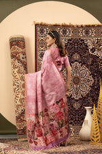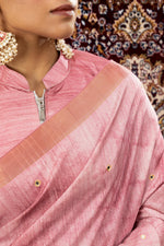 This pink handloom silk saree features elegant digital prints combined with handwork and mirror accents, creating a rich, artisanal look. Perfect for weddings and festive occasions, it includes an unstitched blouse piece for a personalized fit.