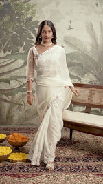 Turn heads in this elegant White saree crafted from luxurious Georgette Silk, admired for its delicate texture and graceful drape. Adorned with golden stone accents and exquisite cut stone patchwork, this saree radiates sophistication—making it a stunning choice for weddings, receptions, and special occasions.