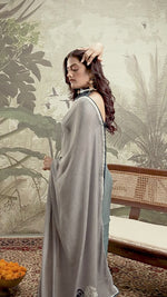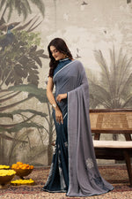 Graceful and artistic, this Navy Blue and Grey crepe saree showcases delicate digital prints and handwork—ideal for festive celebrations, elegant gatherings, and timeless everyday charm.
