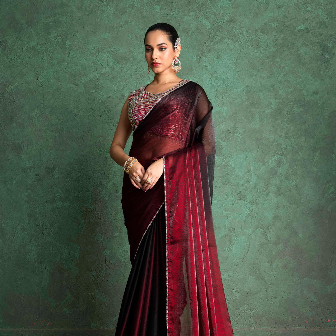 Save 25%Red saree with a sequin blouse, styled with statement jewelry maroon saree with a sequin blouse, styled with statement jewelryRed saree offers a bold contrast with rich textures. Paired with a multi-sequin blouse and ethnic jewelry,  perfect for festivals, weddings, or fashion photoshoots.