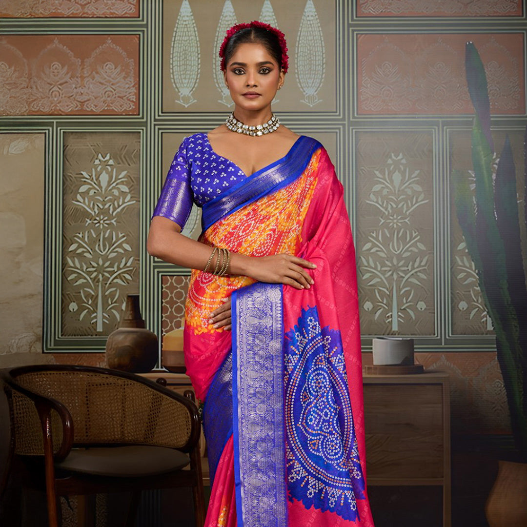 Save 25%Yellow & Pink Bandhani Jacquard Saree with Zari BorderYellow & Pink Bandhani Jacquard Saree with Zari Border