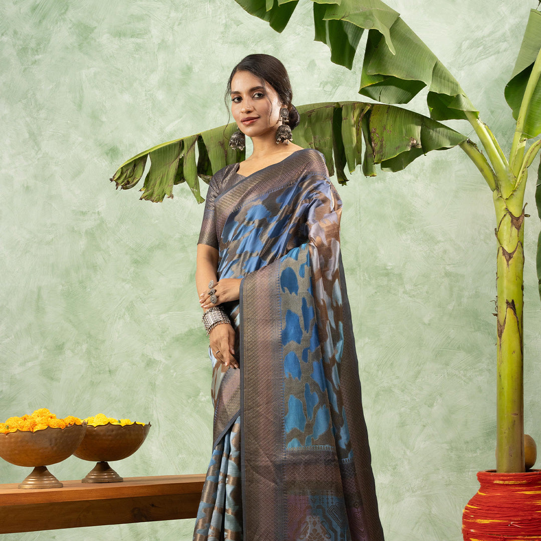 Greyish Blue Moss Zari Printed Saree with Casab Zari Border