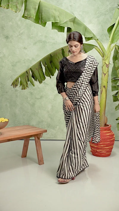Make a sophisticated statement with this striking black and grey chiffon saree, crafted from elegant lightweight fabric known for its airy texture and graceful drape. The saree is enhanced with intricate digital printing and a detailed digital border, adding a modern and artistic appeal.
