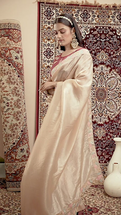This chiku crystal silk saree paired with a maroon blouse offers a perfect blend of smooth texture and rich color. Detailed embroidery adds elegance, making it a refined choice for weddings and special occasions.
