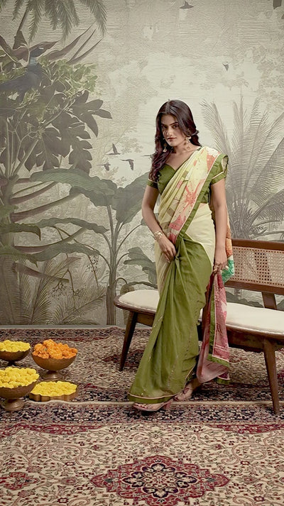 • Occasion: Perfect for festive gatherings, cultural events, or daytime outings, this green and pista saree with printed pallu adds effortless elegance to your ethnic collection.