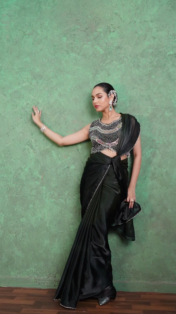 This deep black satin saree with a black-padded embroidered border and stitched blouse is a captivating choice for weddings, festivals, and special celebrations.