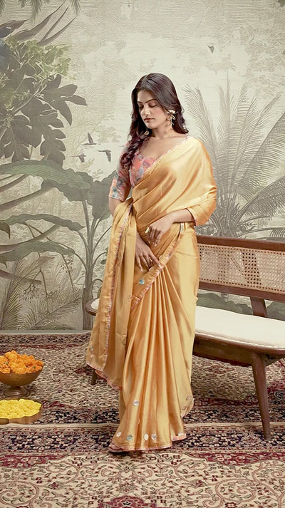 Make a radiant statement in this vibrant yellow saree crafted from soft Georgette Silk, known for its lightweight feel and elegant drape. Adorned with a digital border and intricate patchwork detailing, this ensemble beautifully blends traditional charm with contemporary flair—perfect for festive celebrations and special daytime occasions.