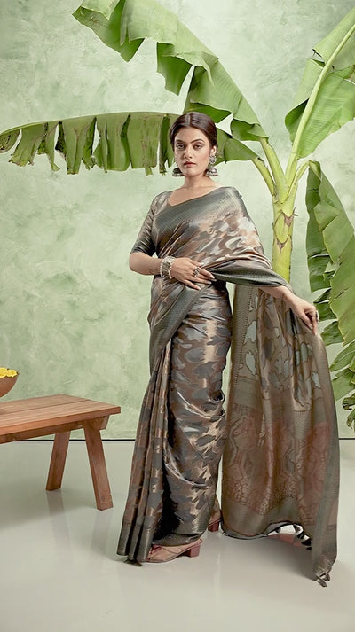 A sophisticated grey Diya Jacquard saree featuring a digital print pallu and position print—perfect for festive, ethnic, and formal occasions.
