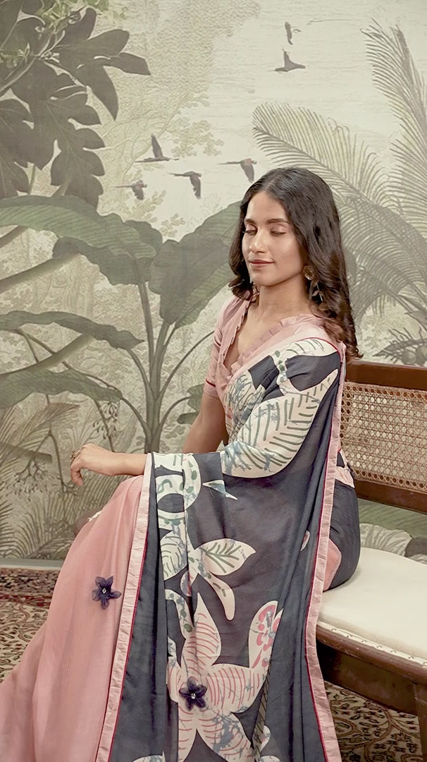 Gracefully blending tradition with modern elegance, this Pink and Grey Crepe saree features a soft printed border, delicate floral patchwork, and subtle handwork—making it a perfect choice for festive occasions and semi-formal gatherings.