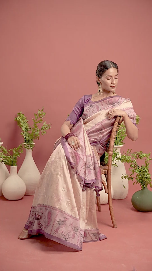 Turn heads in this royal purple Diya silk saree, adorned with elegant juri and embroidery print work. Its rich texture and graceful fall make it perfect for weddings, festive evenings, and grand celebrations.