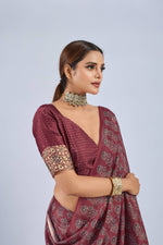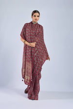 Wrapped in elegance and traditional artistry, this maroon chiffon saree is beautifully highlighted with subtle grey Ajrak patterns. Its rich tone and fluid drape make it a graceful choice for festive gatherings and special occasions.
