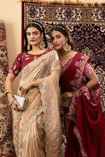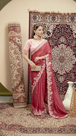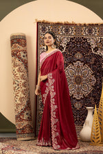 A striking blend of maroon shimmer and pink elegance, this saree brings together fluid grace and festive charm. Designed with an embroidered border and ready-to-wear blouse, it's perfect for weddings, celebrations, and timeless gatherings.