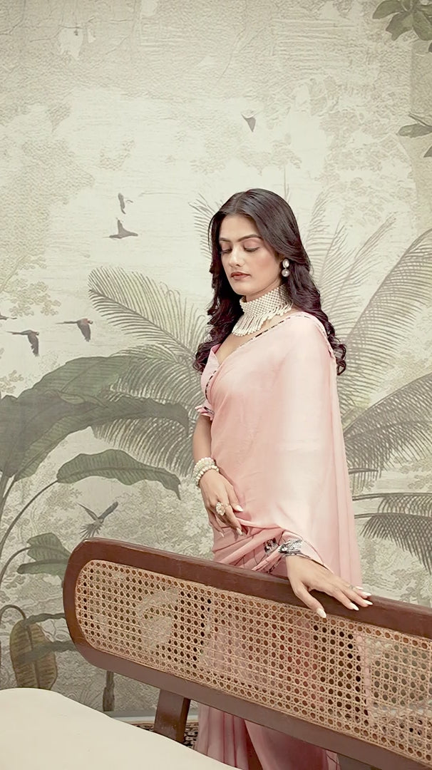 Turn heads in this graceful Pink Georgette saree, featuring modern square digital embroidery and elegant digital patchwork—ideal for festive occasions, daytime events, and casual celebrations.