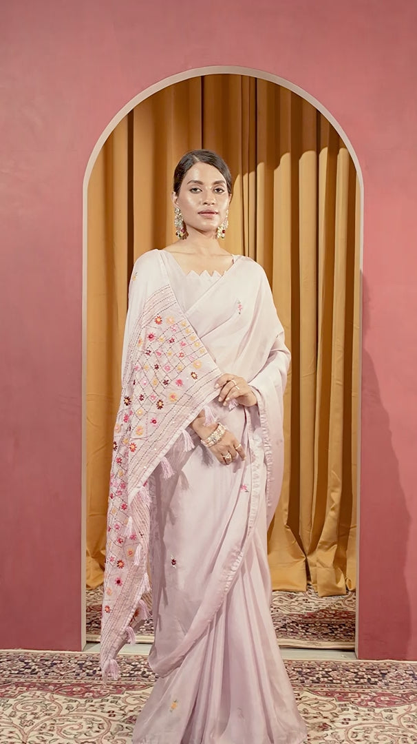 Turn heads with this royal purple Crystal Crush saree, adorned with exquisite Kashmiri handwork. Its shimmering fabric and artisanal detailing make it an elegant pick for festive and traditional occasions.