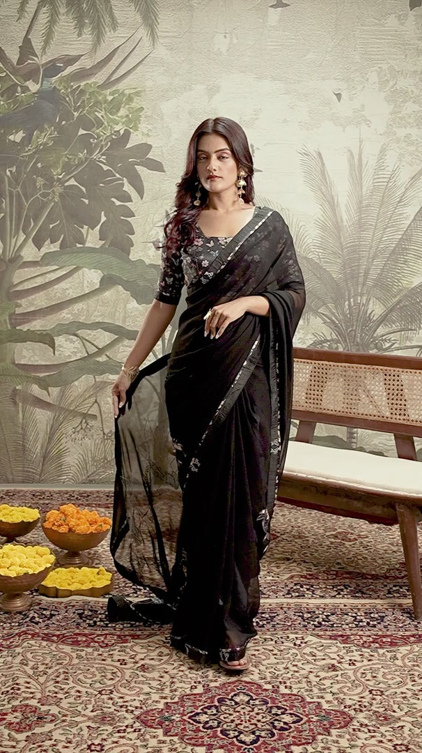 Stylish Black Georgette Silk Saree with Border Embroidery