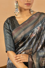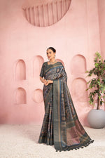 Drape yourself in timeless elegance with this Grey Diya Silk saree—where traditional artistry meets subtle sophistication.